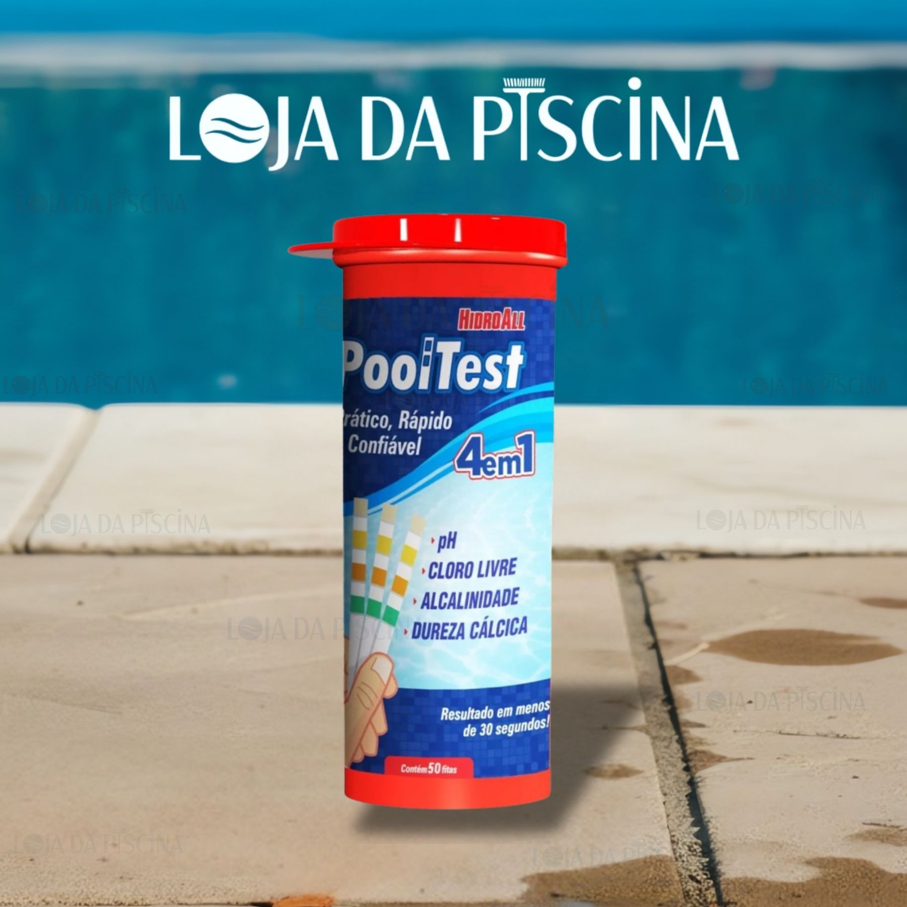 Pooltest 4 em 1 é uma fita reagente de fácil utilização, que verifica a condição da água da piscina instantaneamente e com precisão. Numa única medição, Pooltest 4 em 1 verifica os níveis de cloro livre, alcalinidade, pH e dureza cálcica.